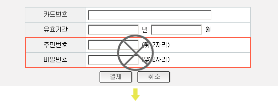 ±âÁ¸¿¡ ÀÔ·ÂÇϼ̴ø À¯È¿±â°£ 4ÀÚ¸®, ÁֹιøÈ£ µÞ 7ÀÚ¸®, Ä«µåºñ¹Ð¹øÈ£ ¾Õ 2ÀÚ¸® µîÀÇ °³ÀÎ ½Äº° Á¤º¸¸¦ ÀÔ·ÂÇÏ´Â °áÁ¦ ¹æ½ÄÀº ´õ ÀÌ»ó »ç¿ëµÇÁö ¾Ê½À´Ï´Ù. 2004³â 1¿ùºÎÅÍ´Â ¾È½ÉŬ¸¯À» ÅëÇÑ ÀÎÁõ ÈÄ ½ÂÀÎÀ» ÁøÇàÇÏ°Ô µË´Ï´Ù. µû¶ó¼, °³ÀνſëÁ¤º¸ ´©ÃâÀÇ ¿°·Á°¡ ¾ø¾î Áö°Ô µË´Ï´Ù.